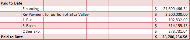 The Buckeye Union School District estimates that approximately 41% of our current student population resides within the boundaries of CFD No. 1. Until 2005, no revenue from CFD No. 1 was used to offset the costs incurred by the District in providing transportation services to these students. In 2005, it was determined that additional/replacement buses were needed as a direct result of the impact of the new development. As a result, on November 22, 2005, the District issued Warrant No. 80078346 in the amount of $514,155.15 for the acquisition of five (5) Blue Bird Buses and on November 28, 2005, issued Warrant No. 80078759 in the amount of $102,831.03 for the acquisition of one (1) Blue Bird bus, for a total of 6 new buses to offset the impacts of transporting the students from CFD No. 1.